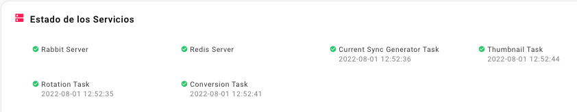 El tercer bloque es el del Server Status, el cual sirve para notificar aspectos como la comunicación de la plataforma con los dispositivos, el servicio de logging o registro, la actualización del fichero de los players, y los relacionados con el contenido que se relacionan con su visualización, el estado, la rotación y la transformación de videos con los parámetros adecuados.