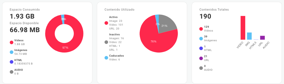 Finalmente, en el quinto bloque se puede ver el espacio consumido por tipo de contenido (videos, imágenes, HTML, audio), el espacio disponible; el contenido usado (activo, inactivo y caducado); el número total de contenidos; y las últimas gestiones realizadas en el apartado de Contenidos, Playlist y Parrillas.